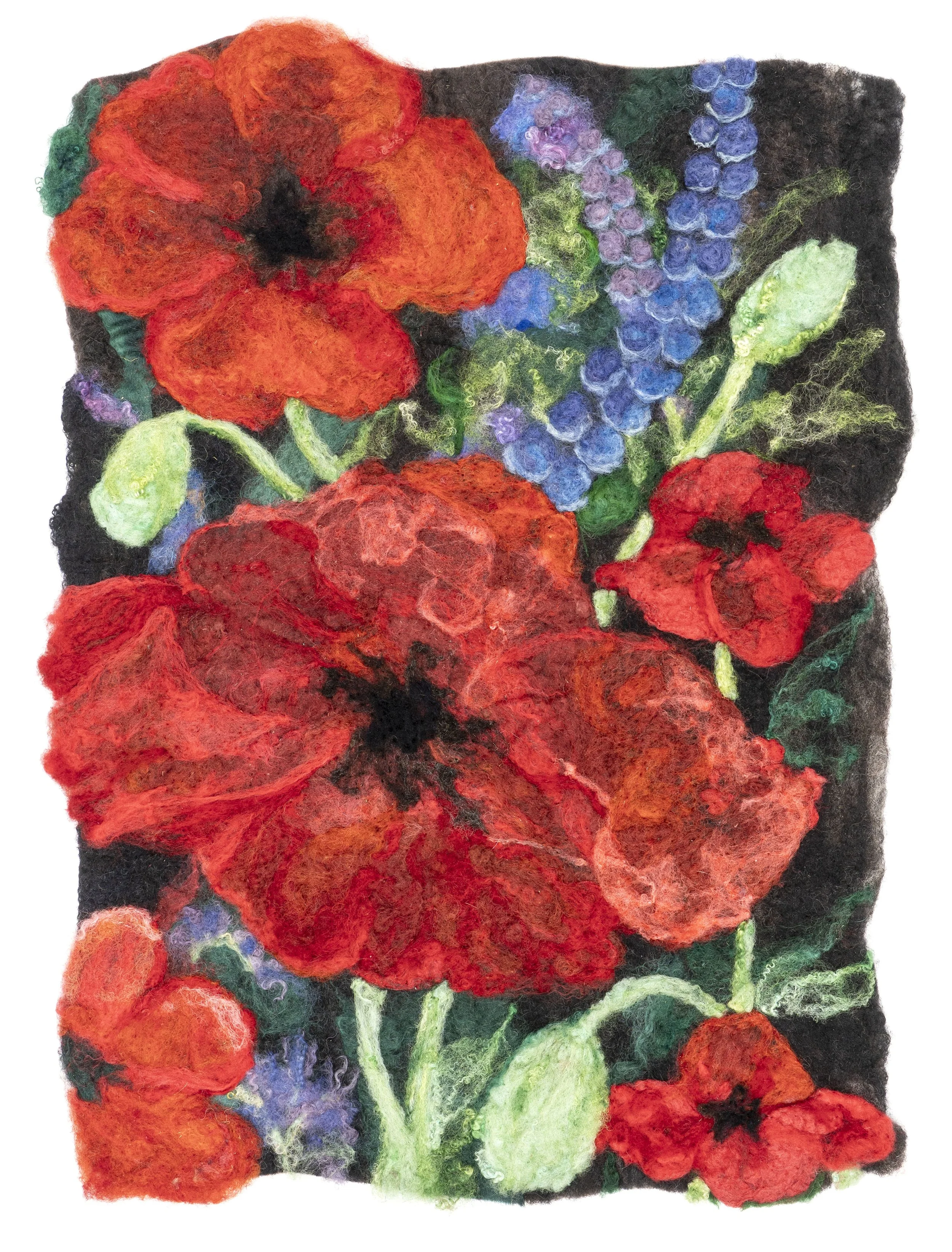 The power of the poppy 28” x 40”. Watercolour with Wool Original $2500