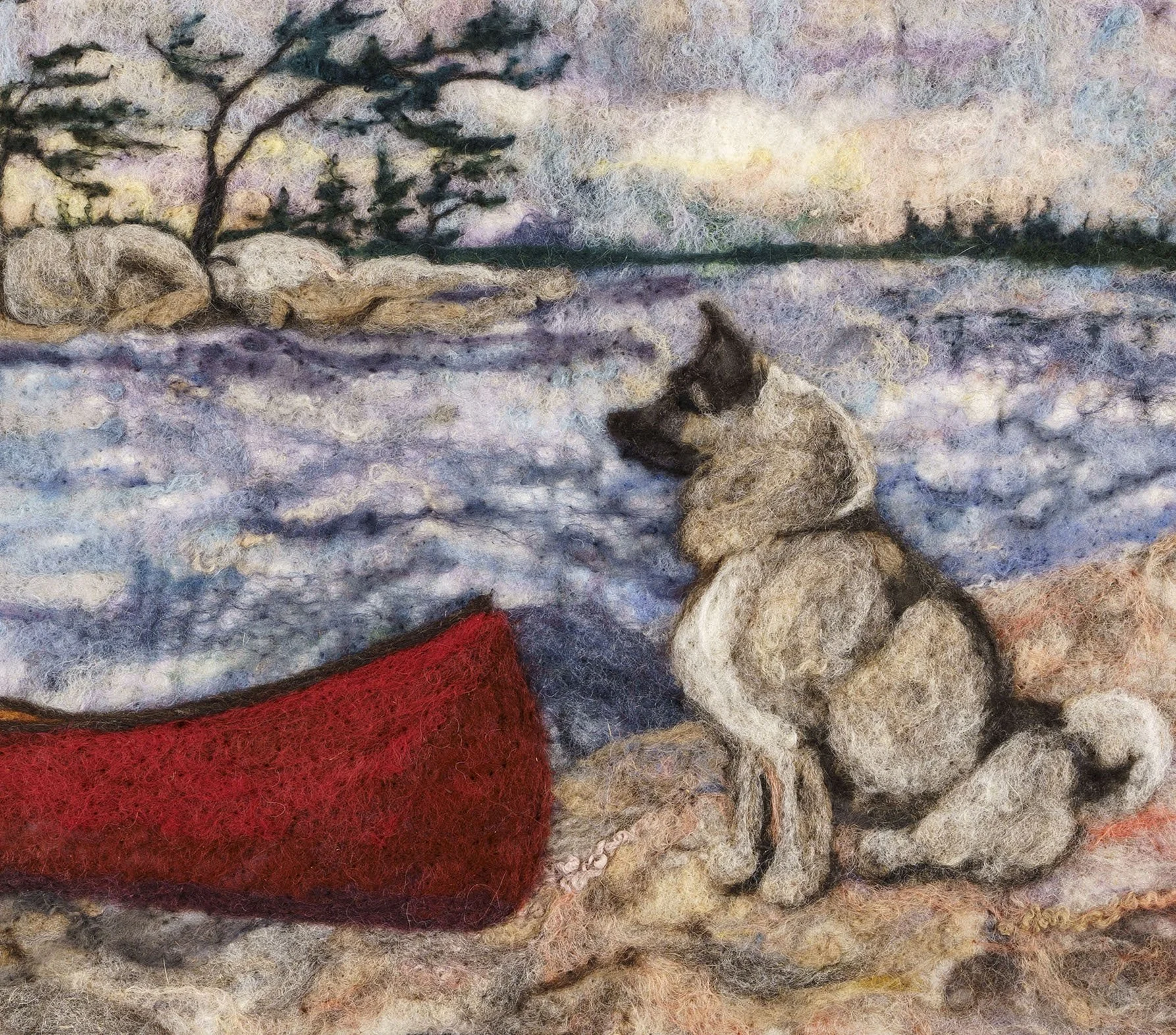 Waiting to go. 30” x 25” Original Watercolour with Wool inspired by numerous canoe trips taken with our faithful pup. $1500