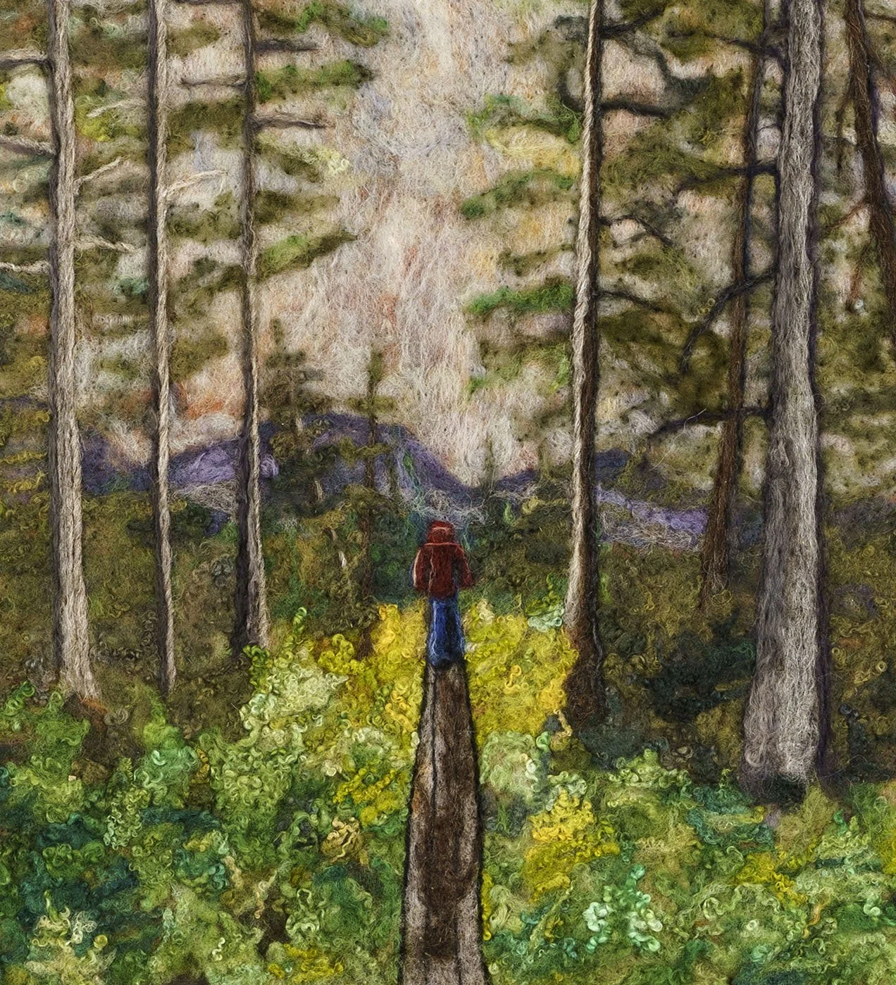 Finding my Way 29” x 34'“. Watercolour with Wool Original inspired by a girls hiking trip in the Gaspe Region of Quebec. Photo credit by Deanna Lavigne. $1800